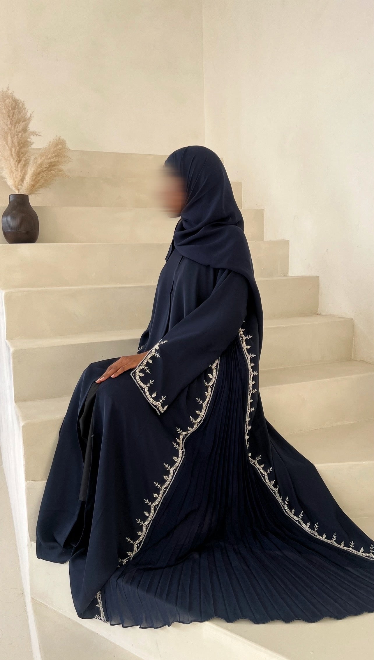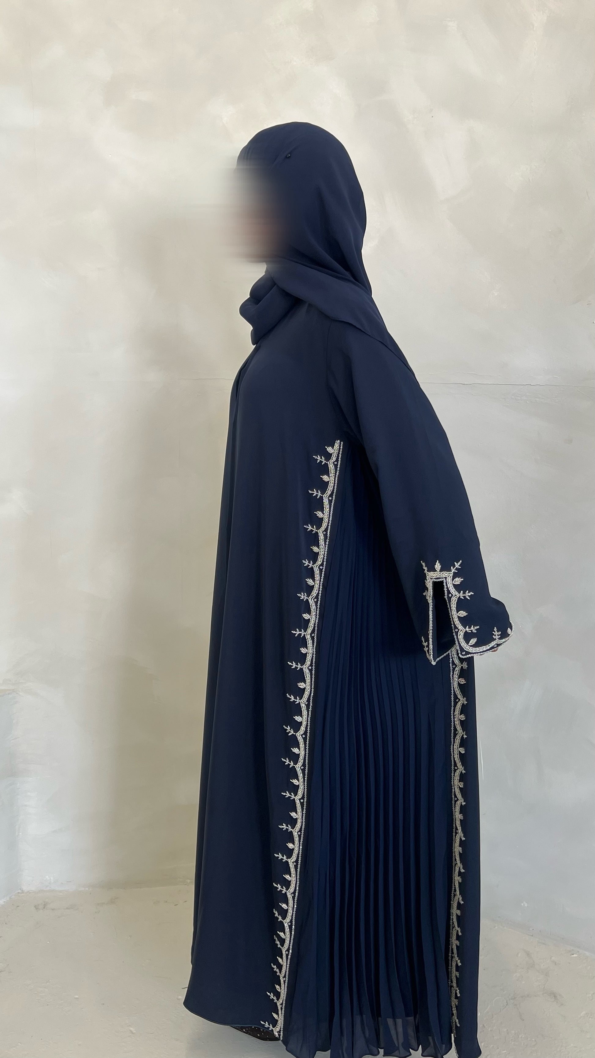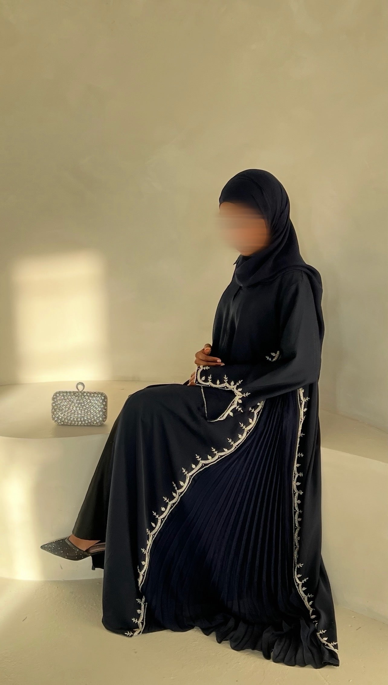 An A-line abaya featuring embellished slit sleeves with intricate handwork on both sides, with a rippled and draped effect. Paired with a matching hijab.