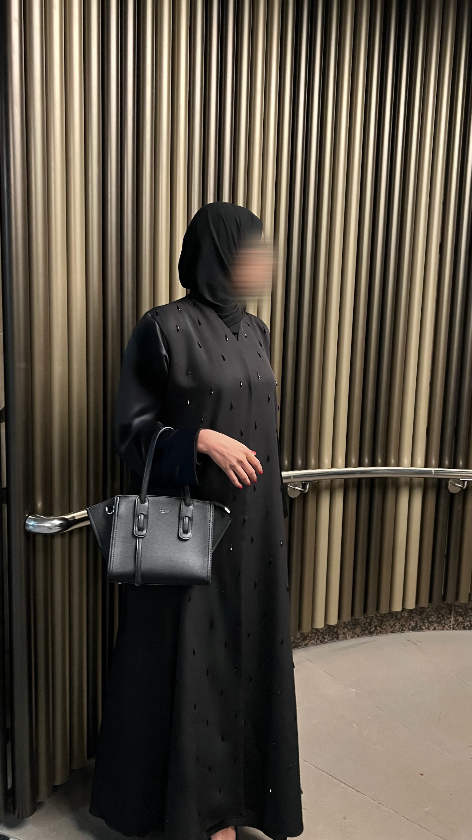 A straight-cut barbie abaya with fitted satin sleeves featuring raindrop shaped crystals running down the front of the abaya. Paired with a matching black hijab for a classy and timeless look.
